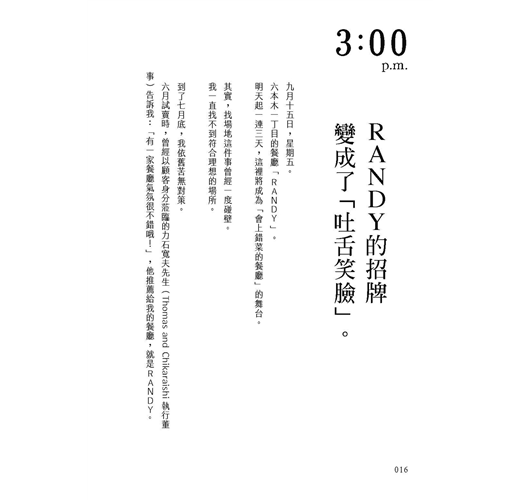 前言 006 01開店前夜 3:00 p.m. RANDY的招牌變成了「吐舌笑臉」。 4:00 p.m. 某天,靈光一閃,餐廳的名字就這樣蹦了出來。 5:00 p.m. 餐廳裡面漸漸被微笑吐舌佔滿了。 Column 01 主題非常有趣,所以我們朝著「好像上錯菜了耶,真抱歉」、「喔,沒關係啦」的情境來設計。 *行銷設計組 德野佑樹、近山知史 Column 02 失智症早已成為全球人的共同議題,因此我認為這個餐廳絕對會爆紅,蔚為流行。 *數位通訊組 岡田聰 Column 03 這個專案的目的不是為了博得特定族群的共鳴,而是希望喚起整體社會的同理心。它與群眾募資,絕對是...