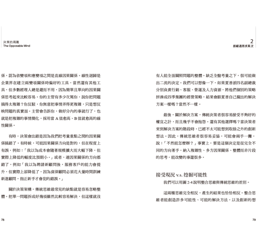 第一章 選擇,對立,創造力 過去我擔任管理顧問、管理學院院長,不斷研究立下成功典範的領導者,嘗試辨別致勝的共同特質。我訪問超過五十位這類型的領導者,發現他們都擁有非常清晰的共同特質。這些領導者除了具備創新及經營天分,還有一項共同特性:同時掌握兩個對立想法的傾向與能力。而且不妥協於任何一個選項,而是創造出遠比兩個對立選項更優越的綜合決策。我稱這種過程為整合思維,或者更精確地說,是一套考量及整合的練習,是傑出企業家的特徵。 人體與絕大部分動物最大的差別,在於人類的大拇指可與其他四指相對,因此擁有其他物種做不到的非凡技能,例如書寫、穿針引線、雕琢鑽石、畫畫,以及用導管疏通動脈等。如果不是有大拇指和其他手指之間的關鍵張力,上述動作都不可能完成。 演化為人類提供了寶貴的優勢,但如果我們不以更複雜精密的方式善用,將大大浪費這項潛力。當我們學習書寫、縫紉、繪畫或打高爾夫球時,就是在利用那兩隻可與其他指頭相對的大拇指,訓練拇指牽動的關鍵肌肉及腦中控制肌肉的部位。如果不探究大拇指可與其他四指相對的可能性,將無法發展出大拇指的物理特性,也無法得知與這項特性有關的知識。 同樣地,我們生來就有容納對立觀點的特質,面臨考驗時可掌握衝突的概念,想出更好的辦法。如果一次只能持有一種想法,就無法看見容納對立想法的特質所能創造的洞見。就像我們可以鍛練兩隻大拇指,完成過去看似不可能的任務。我深信,只要耐心練習,每個人都能學會善用容納對立觀點的特質,為看似棘手的難題找到答案。 經過與超過五十位傑出管理領導者的訪談後,我發現,決策者如果能善用兩個相對概念,架構出嶄新的解決辦法,遠比一次只能考慮一種模式的人占優勢。在任何時間、任何領域,尤其是當前漸趨複雜的世界,運用容納對立想法的特質能夠增加優勢。在資訊爆炸時代,每筆資料都使原本已經高度複雜的局面更加複雜。如果想找出辦法超越種種約束,勢必要採行整合思維。無疑地,現在就是商業界應該採用新方法來解決問題的時刻。 跳脫二選一的限制 商業世界常把各種決定視為一連串「非此即彼」的主張或權宜之計。如果不是穩定成長,就是在新的設計、生產及銷售方法上一馬當先。如果不是持續降低成本,就是在店面和服務上增加投資。如果不是服務股東,就是服務顧客。 但如果有一種二全其美的創新解決方案,既能滿足顧客、又能滿足股東,且不用犧牲任何一方的需求及利益,那會如何?如果可以找出一個周全完善的辦法,既符合業績成長需求,又能繼續為環境負責,怎麼樣?既保有大型組織的穩定,又能追求創新,不錯吧? 整合思維提出一套模式,能夠超越「非此即彼」的二元限制。這套辦法可以在不取消某種解法方案優點的情況下,納入另一種方案的優點。套一句詩人史帝文斯(Wallace Stevens)的話,整合思維的優勢在於「不是二選一,而是兩者兼得。」 整合思維並不限於解決商業問題。第四章將介紹葛蘭姆(Martha Graham)如何運用整合思維將舞蹈帶向二十世紀藝術革命的核心。整合思維在政治上也開創新局。二戰結束後,美國外交家肯楠(George F. Kennan)運用容納對立想法的特質,為看似不可能解決的蘇聯問題找到一線曙光。 葛蘭姆及肯楠的例子說明,整合思維可就深遠、複雜以及相互衝突對立的問題,如恐怖主義、全球暖化及嚴重的生態失衡等,找出大家未曾想過的解答。本書的主旨雖不在處理這些問題,但藉由描述商業界傑出人士如何運用整合思維,為看似無解的衝突找到創新且獲利的解決方案,或可為今日及未來諸多迫切的兩難困境,指出全新的決策方向。 體驗回到家的舒適 整合思維讓伊薩多‧夏普(Isadore Sharp)打造出世界最成功的連鎖高級旅館:四季飯店。夏普創業的起點是在多倫多市郊的小型汽車旅館,完全無法和現在任何一家四季飯店相提並論。夏普接下來經營市中心的大型傳統旅館,也和後來四季飯店的成功典範天差地遠。夏普的這兩段經歷代表了當時旅館業的兩種主流模式——溫馨的小旅館以及設備完善的大旅館。 後來,夏普愈來愈無法接受兩種模式背後的經營主張。他喜歡汽車旅館的親密舒適,但是一百二十五間房間無法創造足夠收入,也無法提供健身設備、會議室、餐廳及其他商務旅客重視的設施。同樣地,他樂見自己經營的大型傳統旅館提供了顧客想要的每項設施,但一千六百間房間的規模無法提供個人特色、讓這裡成為宜人的歇息處。 顯然,兩種旅館在本質上有著無法調合的衝突。顧客可以選擇要享有小型汽車旅館的親切,或是大型旅館的便利,但沒有旅館可以同時提供兩種優點。因此,旅館業者都選擇其中一種類型經營,並接受伴隨而來的缺點。夏普不一樣,他運用容納對立想法的特質,創造出全新的模式。 寶僑的訂價策略 2000年6月,雷富禮(A. G. Lafley)接任寶僑(P&G)執行長。當時公司成長減緩、近乎停滯;旗下前十大品牌中,有七個正苦於市占率下降;公司的研發支出愈來愈多,推出的新產品卻愈來愈少。寶僑與消費者有了隔閡,盈餘與士氣紛紛跌到谷底。 各界紛紛向雷富禮提出建言。大多數人認為,競爭威脅主要來自賣場自有品牌和其他廉價品牌,主張降價;為了讓低價得以持續,必須大幅減縮成本。雷富禮並不反對這個看法。 另一些人認為,唯一的成功途徑是靠