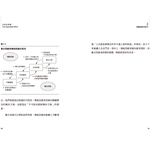 一般人經常陷入非A即B、涉及愈廣愈難取捨的困境,但是馬丁發現許多頂尖人士不但能突破選擇僵局、甚至能在複雜中創造出更好的選項。他訪談從旅館服務、零售消費品、到表演藝術等不同領域五十多位頂尖人士,拆解他們在面對困難問題時背後的思考過程,發現他們都有類似的思考習慣與思維模式,也就是能夠融合對立的觀點、找出兼具兩者優勢的整合思維。