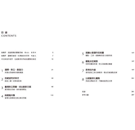 推薦序 超越兩難的關鍵思維/黃永仁、黃男州 推薦序 翻轉思維前,先學會如何思考/馬敏元 中文新版作者序 在超競爭世界創造優勢的路徑 1.選擇,對立,創造力:用整合思維解決複雜難題 2.拒絕退而求其次:跳脫二選一的取捨困境 3.釐清對立現實,找出創新方案:運用整合思維,保持選項開放 4.與複雜共舞:當簡化與專業化無法解決問題 5.描繪心智運作的地圖:觀點、工具、經驗構成個人知識系統 6.觀點決定視野:明辨現實與想像,對立就能變成機會 7.思考的升級:善用認知工具化解衝突,整合思維連點成線 8.以經驗深化優勢:用過去開創未來,不斷創造更佳決策 致謝 參考文獻