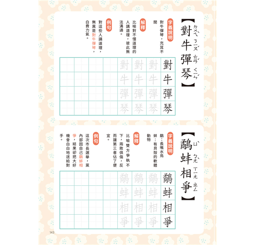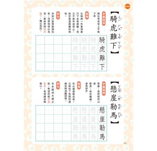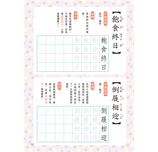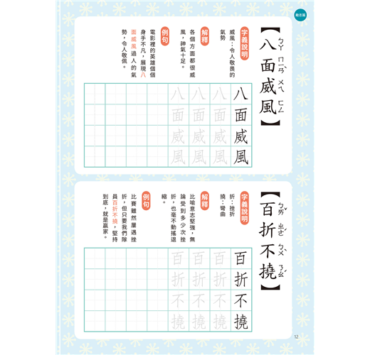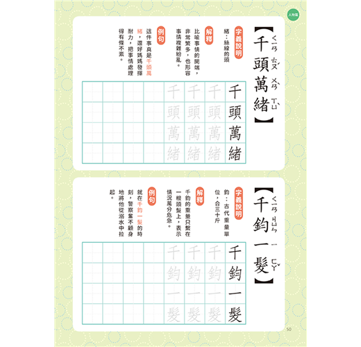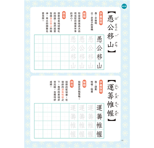 由四個字所精簡而成的成語,透過實境,不僅加深成語運用,更是有趣提高語文練習、練字的最佳選擇,讓孩子在抄寫的過程中,不費力地學會握筆、筆畫與筆順,循序漸進寫好字。