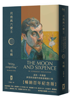 ‧因書中故事主角原型為知名印象派畫家高更Paul Gauguin,因此書衣封面插畫安排高更明亮的自畫像與象徵「月亮與六便士」的圖騰。而精裝封面則以不規則的英文書名緩緩走向月亮譬喻追求夢想,讓視覺更有層次感,也讓故事逐步追夢的步伐更為清晰。