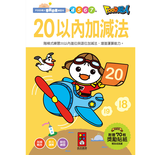 階梯式練習20以內進位與退位加減法,藉由各種題型如合成、分解、合十法、拆十法、橫式計算、直式計算等大量習題中,紮穩孩子的數學根基,提升算術能力。書中附贈FOOD超人獎勵貼紙,讓孩子增加書寫的樂趣。