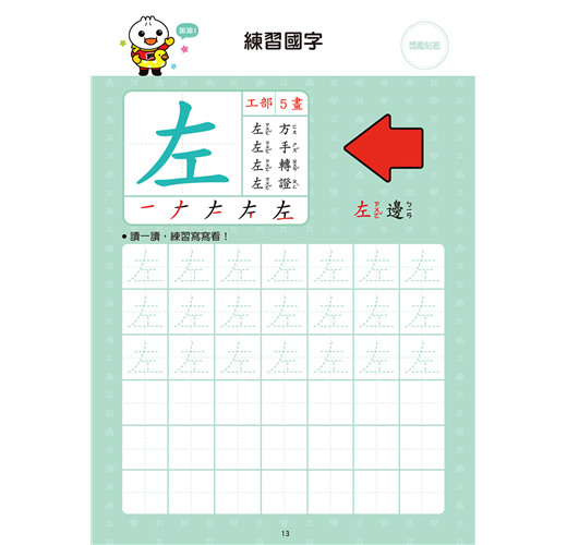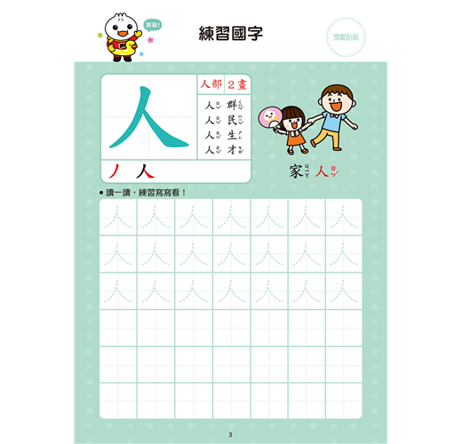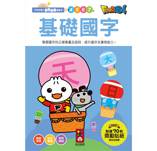 依照筆畫順序練習寫國字,藉由圖像認識語詞,並學習國字的部首、筆畫數,提升識字能力。書中附贈FOOD超人獎勵貼紙,讓孩子增加書寫的樂趣。