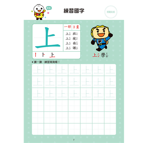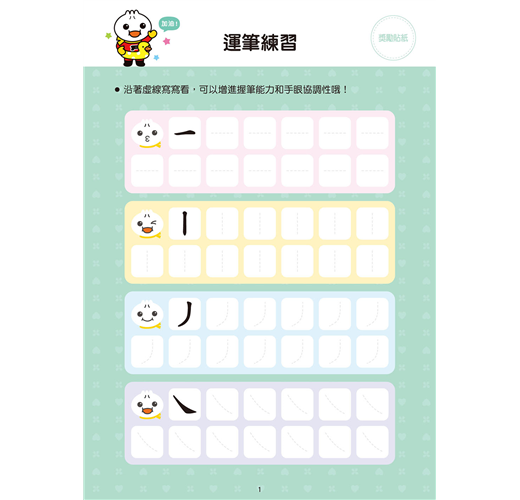 練習寫62個國字,可愛的圖片加上正確筆順,讓孩子在練習寫國字的同時,增進運筆能力。