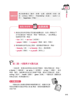 本書每一個重要的文法觀念,都以一個完整的章節來說明,從名詞、冠詞,到最容易讓讀者混淆的介系詞,接著延伸至詳細的動詞時態、完整句型、精闢文法等等,在每章皆詳細介紹,難度由淺入深,以循序漸進的方式加強文法的學習規則,讓你一次擺脫模稜兩可的文法解釋,從零開始打下穩固基礎!