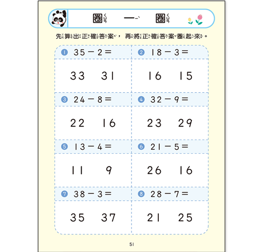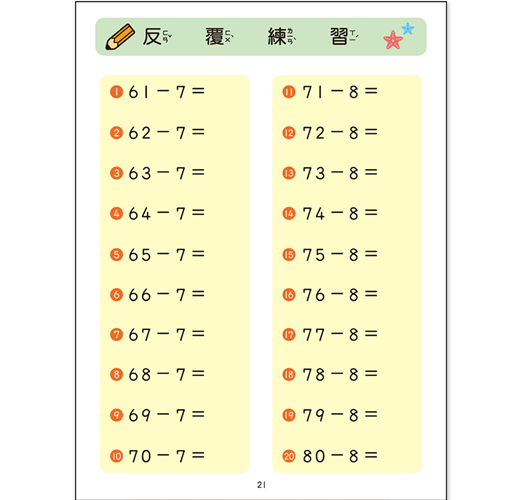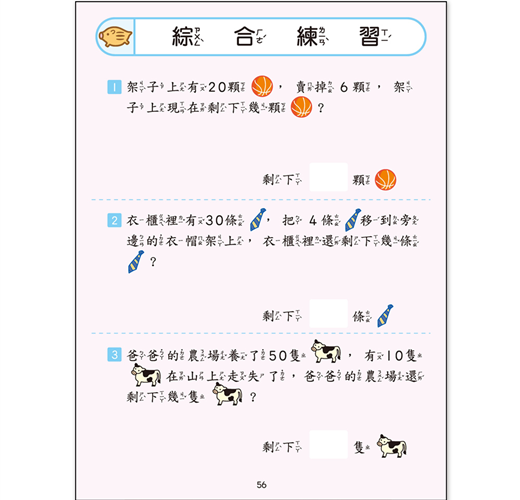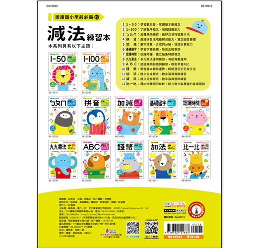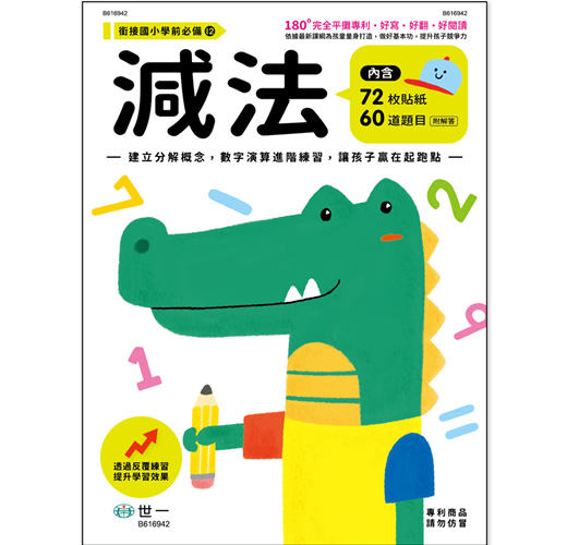 本書是依據幼兒能力發展設計,由簡單演算漸進到複雜演算、由分解概念進而到減法的練習題,此外並加強二位數的減法,以增進孩子的書寫算式能力,讓孩子在學習減法過程中奠定良好的數學基礎,另附有一大張獎勵貼紙。專為學前兒童研發,做好入學前的準備。
