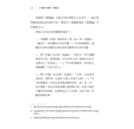 為證明《佛護論》亦破自性的同時亦立名言有──就以世間通俗的說法而說的存在,譯者於下述摘取幾段《佛護論》中的重要文句。