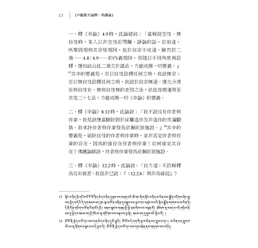 三、釋《中論》12.2 時,此論說:「自方道:不該解釋為沒有痛苦。我豈非已說:『(12.2.b)則非為緣起』?我說痛苦是緣起,卻不說苦是由自作、由他作、由自他二者作,以及無因而生。」其中的要義是,雖有痛苦,但痛苦非自性有。