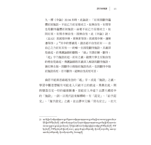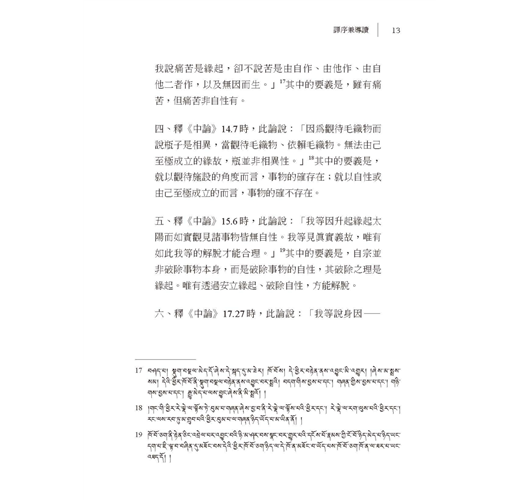 五、釋《中論》15.6 時,此論說:「我等因升起緣起太陽而如實觀見諸事物皆無自性。我等見真實義故,唯有如此我等的解脫才能合理。」其中的要義是,自宗並非破除事物本身,而是破除事物的自性,其破除之理是緣起。唯有透過安立緣起、破除自性,方能解脫。