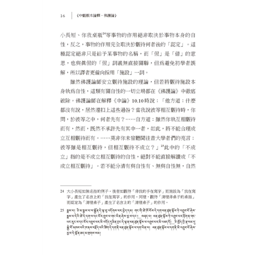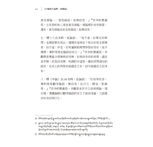 八、釋《中論》21.16 末時,此論說:「於我等而言,事物皆是觀待施設,無自性,如幻化、陽焰、影像等。」其中的要義是,中觀者並非不立任何理論。相反地,佛護論師以觀待施設的安立了破自性論,又說諸法存在如同幻化。