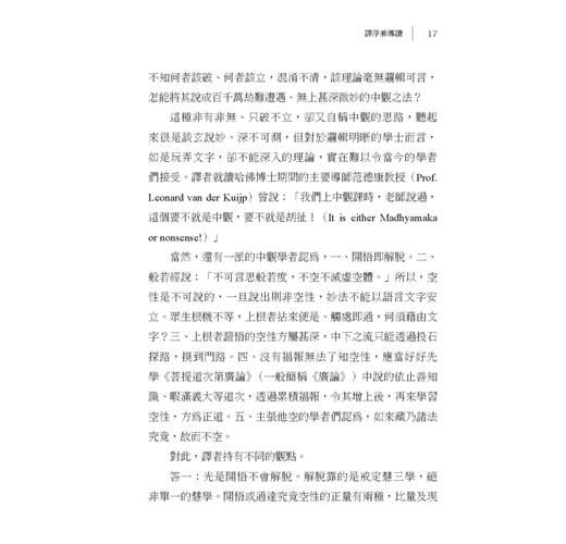 這種非有非無、只破不立,卻又自稱中觀的思路,聽起來很是談玄說妙、深不可測,但對於邏輯明晰的學士而言,如是玩弄文字,卻不能深入的理論,實在難以令當今的學者們接受。譯者就讀哈佛博士期間的主要導師范德康教授(Prof. Leonard van der Kuijp)曾說:「我們上中觀課時,老師說過,這個要不就是中觀,要不就是胡扯!(It is either Madhyamaka or nonsense!)」