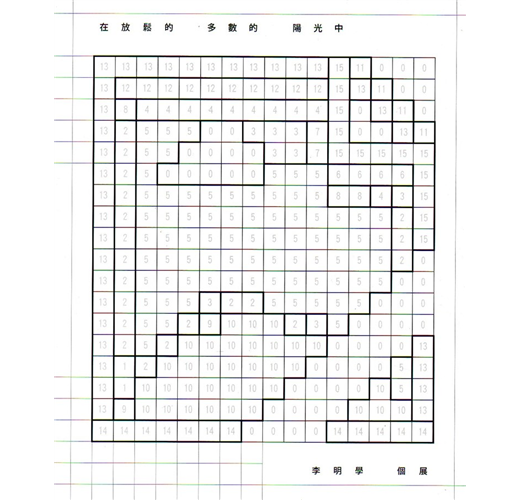 本展以「在放鬆的多數的陽光中」命名,改編自布希亞的著作標題「在沈默的多數的陰影中」。此展覽探索各式陳列商品所造成的視覺符號經驗、社會價值、語言習慣等當代可能意義。藝術家李明學藉由個人幽默方式重新詮釋生活周遭事物,以荒謬與令人莞爾的誤讀方式,讓作品所衍生出的意義思考和約定俗成的意義交匯、轉換並相互地嫁接在一起,僵化武斷與理解世界的方式在此產生岔路或繞路的機會。換言之,商品與物件的表象理解,在美學介入中,釋放使用經驗與認知的慣性,進而生產出差異的意義。