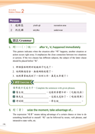 包含教學目標、語法說明、語法練習題參考答案、補充及提醒、作業本聽力文本及參考答案。最後加上一份詞彙語法練習單,此練習單的難度較高,教師可當作複習卷使用,以評量學生的漢字、閱讀能力,亦可當成一篇文章進行錄音或就內容提問,訓練學生聽力、說話等篇章能力,可謂多用途的評量卷。