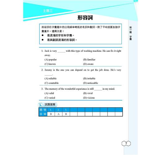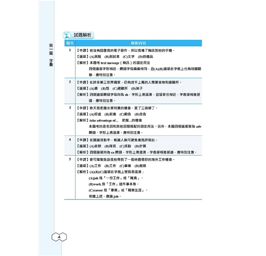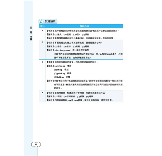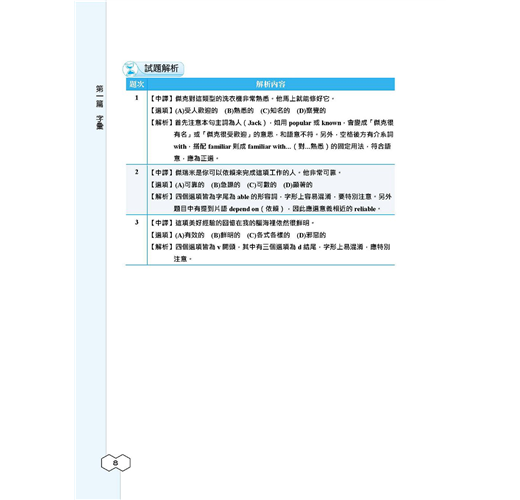 先充分練習題目再核對答案與解析,就能收到充分的學習效果!《英文題庫攻略》採用「名師式詳解」,每道題目都撰寫詳細透徹的解析,有如名師在旁指導解惑,任何難題輕鬆舉一反三。題目與解析獨自編排,省去邊寫題目邊遮答案的困擾。題庫就是你的彈藥庫,妥善利用「題庫書」工具,金榜題名一點都不難!