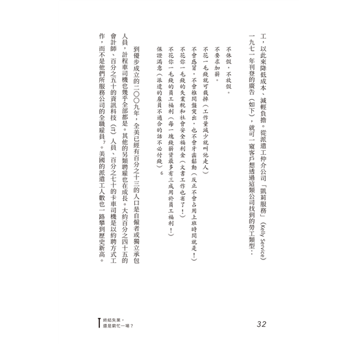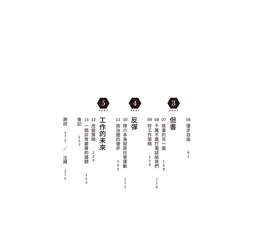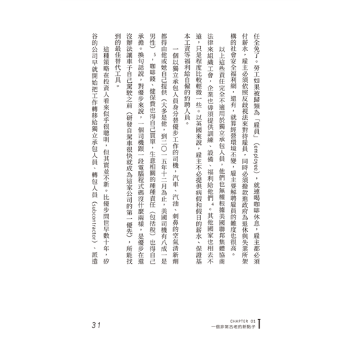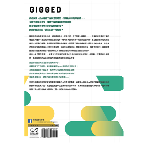 她深入探尋這種新型經濟型態對不同職業的人所產生的影響,以觀察入微又發人深省的筆調娓娓道出統計數據背後的真實人生,希望透過揭露零工經濟帶來的美好背後,其實仍有種種問題與挑戰待解,進而促使這個「安全網」能夠真正發揮其力量,拉近我們與自由的距離。