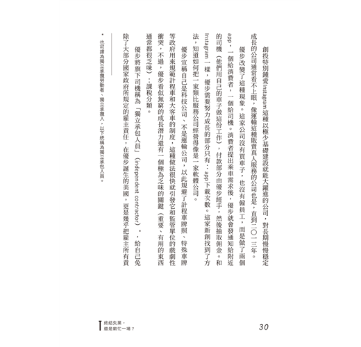 這並不是投資人當初買單的單位經濟效益(unit economics)。Zitural是一家提供虛擬助理的公司,它說它就是因為將獨立承包人轉為雇員,才會造成二〇一五年被迫裁掉幾百名員工(這家公司將勞工都改成雇員之後,不久即被收購)。Zitural的共同創辦人告訴《彭博》:「現在檯面上這些隨需共享經濟公司,每一家都有承包人員,如果必須把承包人員轉成雇員,勢必會破壞他們的商業模式。」