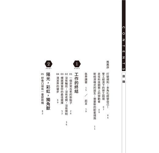 職業和工作的變革來自科技:網路接案平台、派遣公司、人工智慧、機器人⋯⋯,不僅打破了傳統行業的穩固性與疆界,更大幅降低做生意的成本,職場不再侷限於單一地點與固定時間。零工經濟因而成為創投寵兒、新的熱門議題、大範圍經濟問題的現成解方,然而零工經濟雖確實可以替某些人創造機會,但也會把原本就有的問題放大:缺乏法律保障、做白工的風險增加、接案穩定性不足、損害勞工權利。這個新興經濟迫切需要展開對話,討論如何在科技顛覆工作的同時保護這些自由工作者。