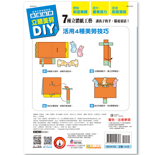 本書收錄7種趣味、生動的遊戲立體手工圖型,難易適中,讓孩子能親手操作,學習拆、折、拼、貼等美勞技巧,同時訓練手部肌肉發展與手眼協調能力,進而增進立體空間概念,藉由如此好玩的組合遊戲,讓孩子體驗藝術創作的樂趣。主題多元,難易適中