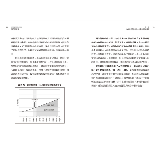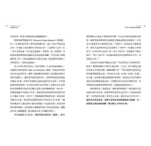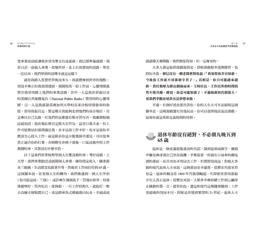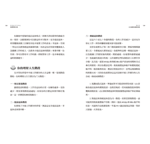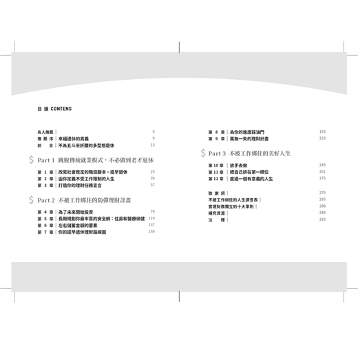 Part 3:回到生活層面。到了這個階段,工作第一的人生已不再必要,因此接著便是規劃要怎麼適應不再需要工作的人生,在財務和情緒層面做足準備,將個人健康設為最高順位,並善用你奪回的空檔時間。最重要的是,教你度過最適合你的人生。