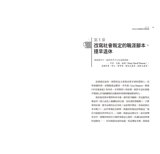 但你不必因為別人也是這樣,就照別人的腳本過活。你可以自創腳本,掌握自己每一天的時間,從要做多少工作到是否需要設定鬧鐘,全都由你作主。而我會教你打造屬於自己的提早退休人生,而這絕非不可能的任務。