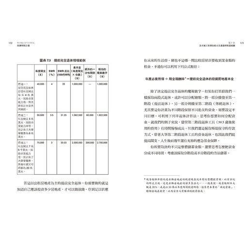Part 1:要請你想像振奮人心的提早退休、半退休或事業中斷人生,例如:每五年休息一年,或是十年休息一次。書中會講到在傳統就業模式中找到意義和成就感的方法,要求你仔細檢視人生,思考為了實現夢想,你願意改變或放棄哪些事。例如你是否願意委身住在較小的屋子裡、放棄房車,抑或不再買非必要品(不用擔心,以上都不是非做不可,但要是你改變的意願越高,就越能提早達成目標)。