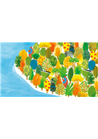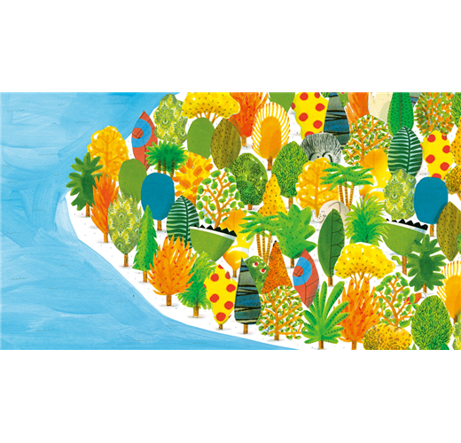 翻開《大象在哪裡?》,迎面而來的是一片蔚藍海洋,遠處有座亞馬遜熱帶雨林的小島。仔細瞧瞧,蓊鬱繁茂的樹木後,是誰藏身其間和讀者玩躲貓貓呢?