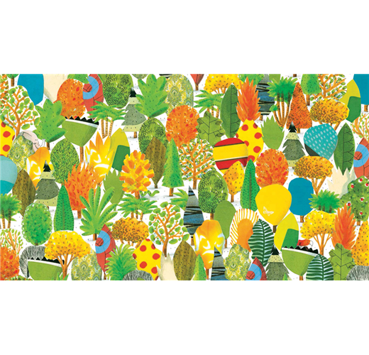 巴胡以逐頁的空間變化、線條色彩的運用,突顯「經濟發展」和「生態保育」的拉扯。茂密的雨林變得稀疏,越來越多房子、道路和汽車,從書頁左下角一口一口地侵吞雨林的生長空間。動物失去了棲息地,生存範圍不斷被壓縮,最後只能躲在同一棵樹後。對比原先的雨林以鮮豔色彩、自然曲線繪製,水泥房子卻帶著硬邦邦的線條,彷彿是被大量複製,每棟都有一樣的冰冷外觀,一格格的窗戶流露不出絲毫居住的暖意,而僵硬的直線也變成動物園的鐵柵欄,緊緊關住動物和僅存的那一棵樹。