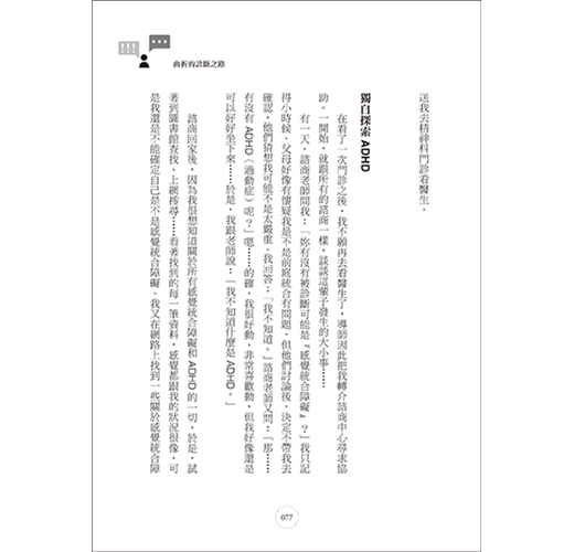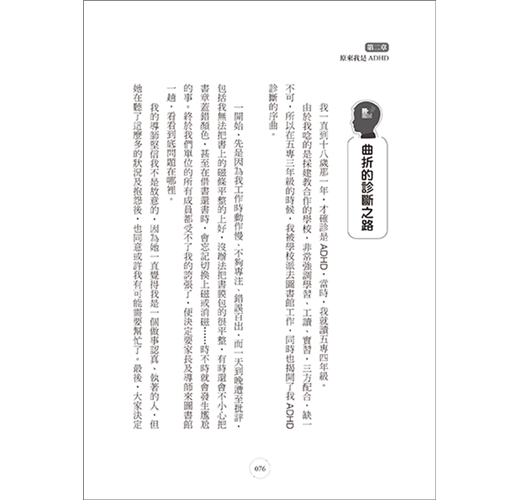 收錄從發病→確診→就醫→用藥→求學→就業……從小到大以及從學校到社會一路的成長過程;分享在特質/性格/學習/生活/人際/職場……各方面遇到的問題、狀況與得到的結果,助你更瞭解自己,並能提前做好相關準備、防患未然、避免重蹈覆轍,有效幫助減少更多挫折/失敗的痛苦。