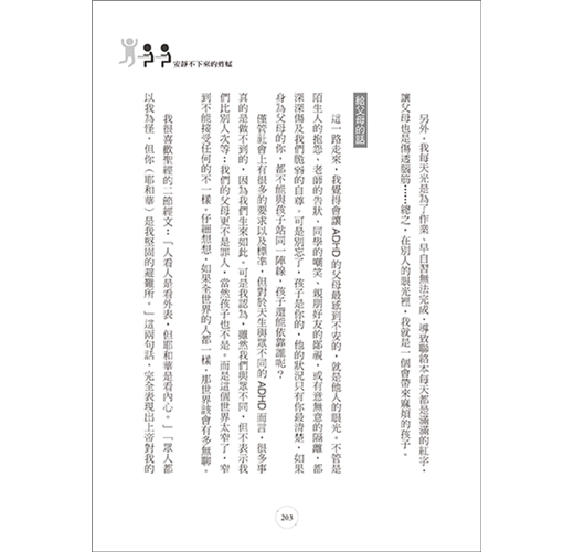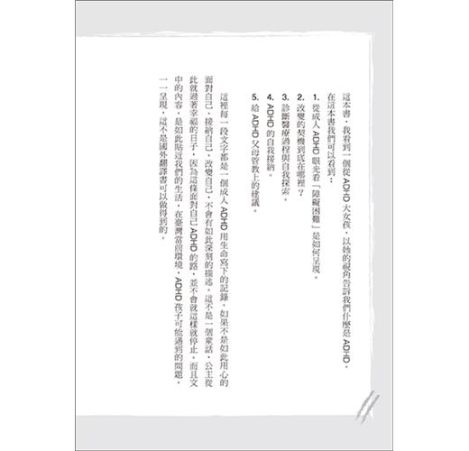 1.作者以自身「ADHD過動兒」的一路成長經驗分享最真實的過動人生路。是一本成長記錄;更是一本實用的工具書。