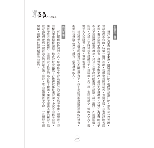 但要記得:「這不是你的錯,是過動兒也不是你願意,你天生就長這樣。你有很多只有你才有的優勢,你有智慧、善良、純真、有創意,只是你在自己的弱點上,需要費點力;你要學會怎麼專心、怎麼控制自己、怎麼交朋友、怎麼做事……當你學會了以後,你會發現,自己比其他人還棒!」