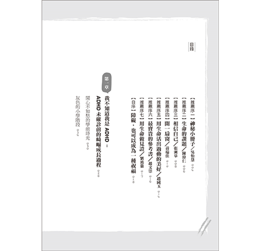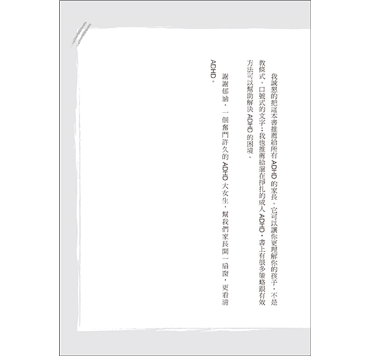 我想藉由這本書感謝每個幫助我的人──我的父母、醫生、同學、所有的朋友,特別是我的ADHD朋友們,因著相知相惜,我們常常彼此鼓勵、互相傾吐;感謝過去教過我的每個老師,特別是復興國中的李曉菁老師、長庚科大蕭冰如老師、趙國玉老師、林冠良老師、張溯皋老師、徐麗明老師,曾在西區工作的沈易達老師;另外,還要謝謝幫助過我的教授們──前台北市立教育大學楊坤堂教授、台北市立教育大學吳怡慧教授、新竹教育大學孟瑛如教授,還有赤子心的前祕書長蔡美馨及赤子心的孩子們和家長們。最後我要感謝愛我的天父──上帝,並將一切的榮耀及感恩歸於祂。