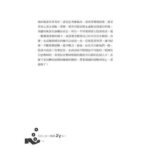 100%可複製的祕技,不用搞懂複雜的財經知識,只要跟著作者的祕技一步一步做,就可能持續獲利,等本金回收之後,這套自動化的投資系統就像是一台屬於您的提款機。