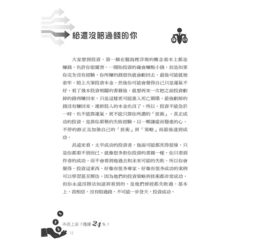 現在,你有沒有想過,投資100萬元,年收益可以有20%~25%,即可以獲得每月1.7~2.1萬元左右的收入?而且基本上,這種投資就像買基金一樣,不需要你去看盤,不用做事,不用研究走勢,也不用思考,坐著就有錢收。這種投資方法,台灣很多人根本連聽都沒聽過,市面上相關方向的書籍也非常少。聽起來很像假的吧?老實說在我自己做到之前,我也不太相信,不過,別人做到了,我自己也做到了,我相信,你也可以做到!