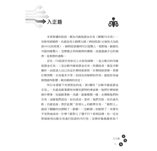 本書要講的投資,稱為外匯保證金交易(簡稱FX交易),有使用到槓桿,也就是用小錢博大錢(例如投資1元被放大為投資100元的效果)。槓桿投資獲利可以很驚人,相對地,虧損也可能同樣驚人,怎麼樣去利用槓桿的優點,而盡量減少它的傷害,是相對的重點。