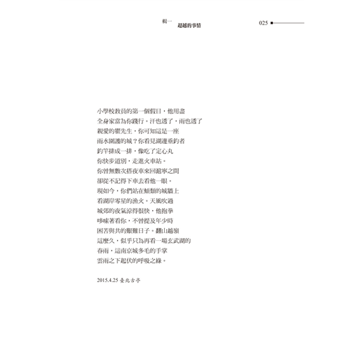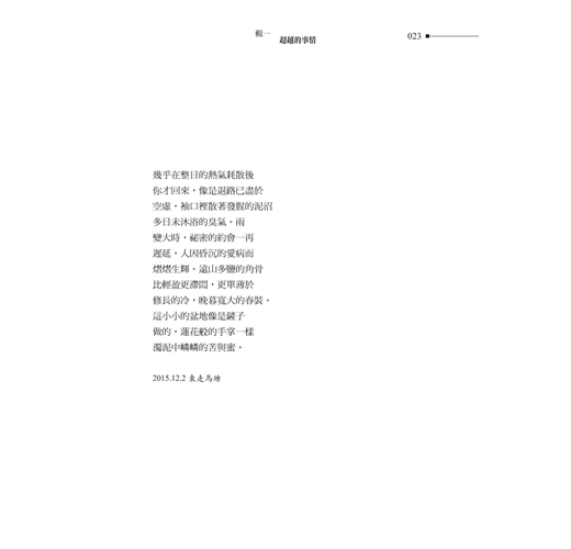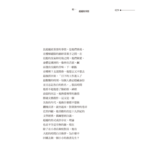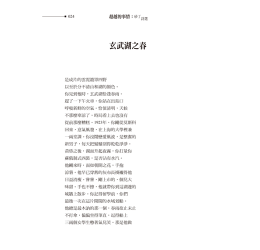 ★個人化歷史想像力的詩學動力,貫通並自我擺蕩於青年知識者日常生活和超越性遠景之間豐富的張力空間,並雜入多維的當代情感經驗,而融匯於延展、跌宕的敘事化抒情技藝之中。
