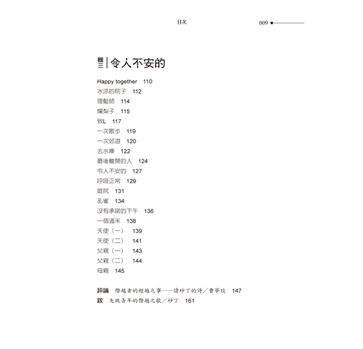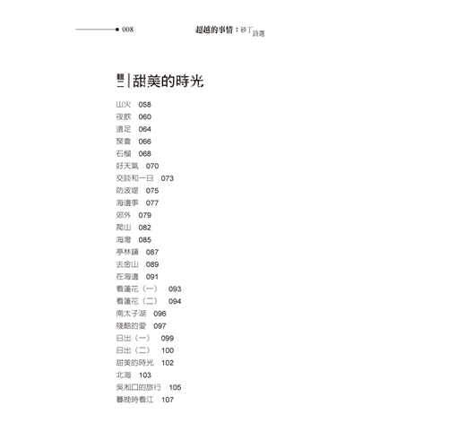 本書乃大陸青年詩人砂丁所創作之當代詩的精選結集,收錄其2011至2018年創作之詩歌作品60餘首。詩集分三輯編排,展現了青年詩人砂丁在個人化歷史想像力生成面相上的努力,對當代生活日常經驗的細心打理和咀嚼,及其對緊緊附著於當代生活內部的框架性焦慮結構的探視,而統御於青年知識者於室內室外生活間的穿梭、擺蕩、猶疑和逡巡,最終匯入一種「失敗者」的聲音及其可能的超克動力。