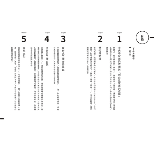 事後我也明白到,嚇人的不只是選擇工作這件事情,而是選擇一個一輩子的工作,人家一直反覆告訴我錯誤的觀念,說人人都可以找到自己夢想中的人生道路,我受到鼓勵,要選擇一門學科攻讀,變得精通,但是我在職業生涯中能成功卻是來自多樣的專案、目標和選擇。你不必選擇一種工作,或是精通一件事情,事實上,複合式工作的生活型態具有無限的正向及可能性,也因此有了這本書,我們之中某些人──大部分的人──生來都不是為了把生命奉獻在單一件事情上。