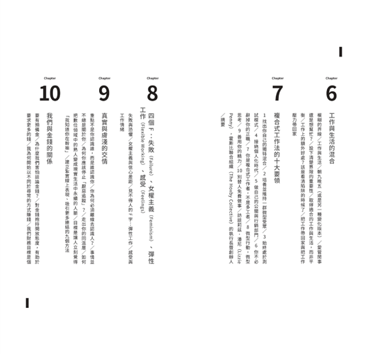 坦白說,我並不喜歡這本書的中文名字,我理解這個書名,可以吸引到更多人的眼球,但是這個中文書名,我覺得並沒有翻譯到這本書的精髓,這本書,我愈看愈覺得有意思,特別願意為這本書推薦的原因──作者分享的,不只是「如何賺錢」,而是有關於如何設計出屬於「你的」職涯與生活。