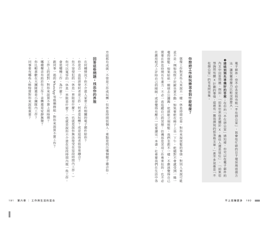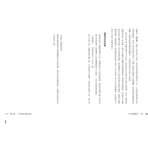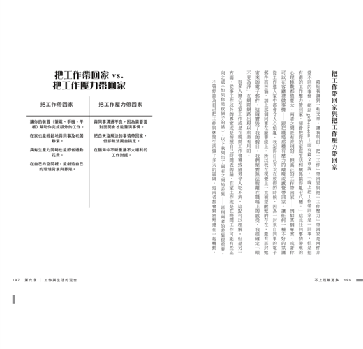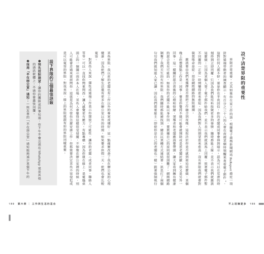 模糊的界線/工作與生活/朝九晚五(或是另一種變化版本)/愛管閒事還是想幫忙?/設下清楚界限的重要性/取得適合的工作與生活,而非平衡/工作上的額外好處?該是看清陷阱的時候了/把工作帶回家與把工作壓力帶回家