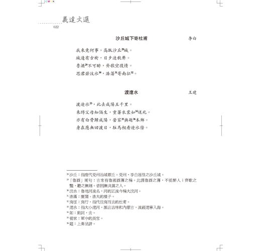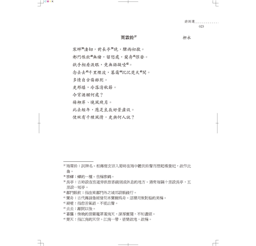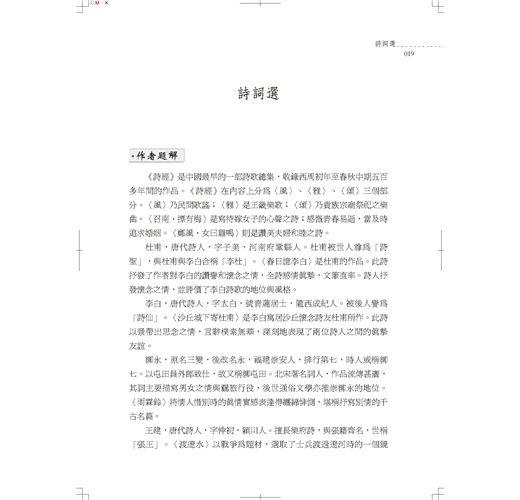 詩詞選女曰雞鳴/詩經.鄭風;標有梅/詩經.國風;春日憶李白/杜甫;沙丘城下寄杜甫/李白;渡遼水/王建;雨霖鈴/柳永;白色的歌/敻虹