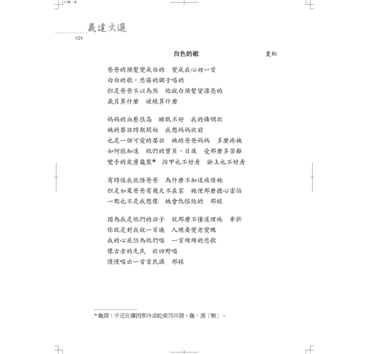 敻虹(1940-),本名胡梅子,臺灣臺東人。〈白色的歌〉是一首現代詩,全詩以腋白色夜為題,寫出了父母的劬勞,以及子女與父母之間的愛。