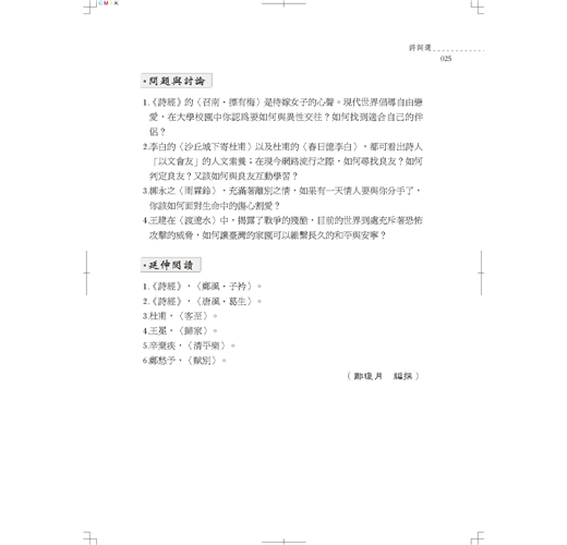 (二)每篇選文依序有作者題解、課文、問題與討論、延伸閱讀等。