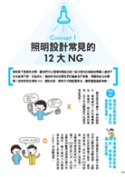 本書從認識各種光源與照明知識出發,一步步剖析照明在室內空間設計上的原理和實際應用,從專業的角度建構第一本專屬並適用於台灣環境的照明設計專書,範圍涵蓋居家住宅照明到商業空間與其他場所,以平易近人的述說方式並搭配豐富多元的插畫與空間實景圖,提供讀者對於照明的認識、重視、解決方式和更多想像空間。