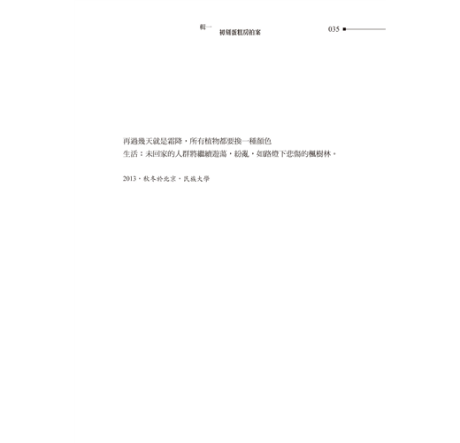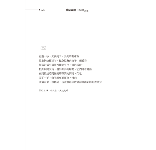 本輯六冊詩集內,除詩作之外,另收錄有每位作者的詳細介紹和自作跋文,更有他人撰寫的針對他們作品的分析,出於體例的考慮, 此處便不再對他們進行一一的介紹和評論。我願意將本次「結集」的「集結」,視為六位中國大陸青年的詩之翅翼初翔後的首次著陸。