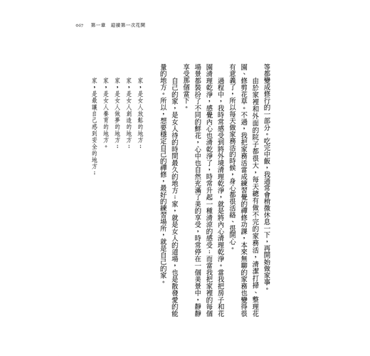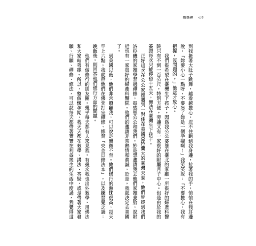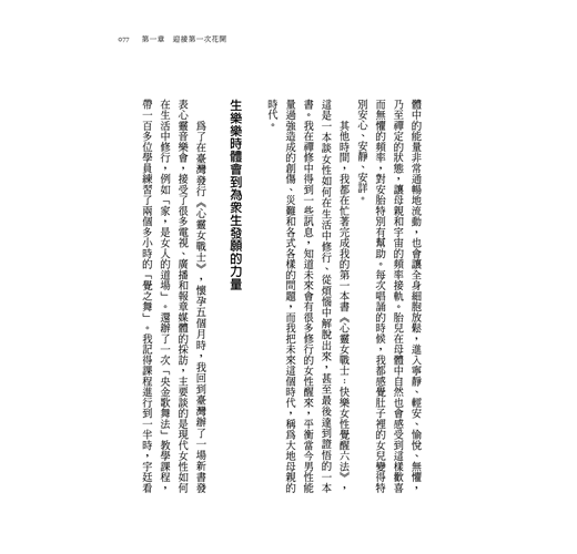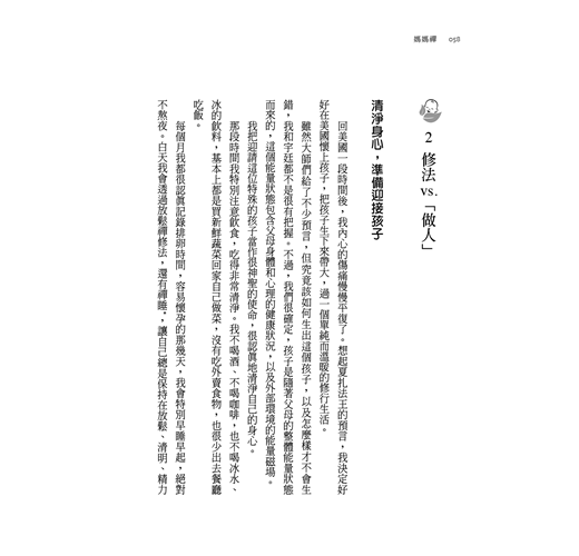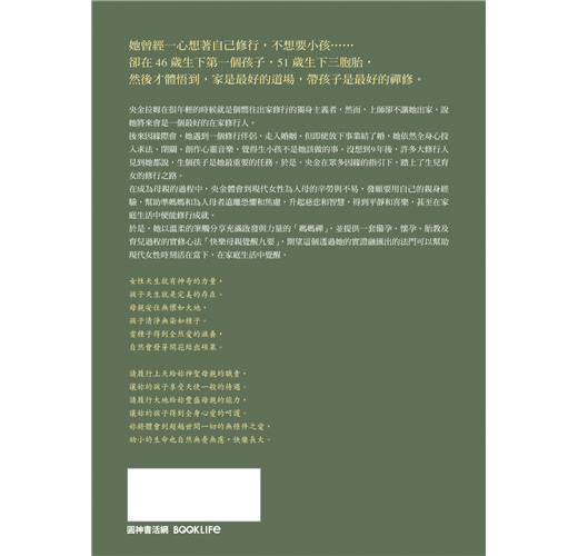 於是,她以溫柔的筆觸分享充滿啟發與力量的「媽媽禪」,並提供一套備孕、懷孕、胎教及育兒過程的實修心法「快樂母親覺醒九要」,期望這個透過她的實證融匯出的法門可以幫助現代女性時刻活在當下,在家庭生活中覺醒。