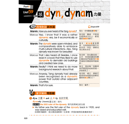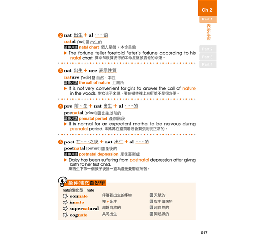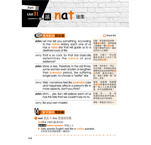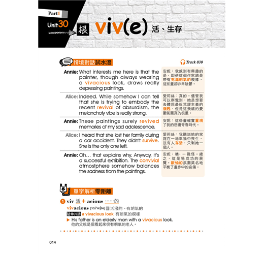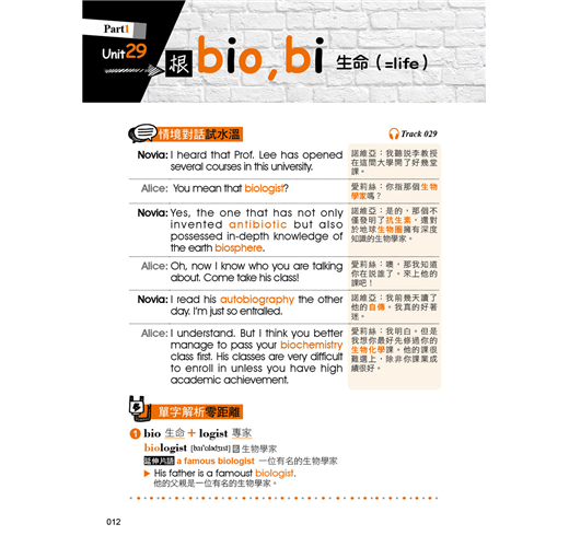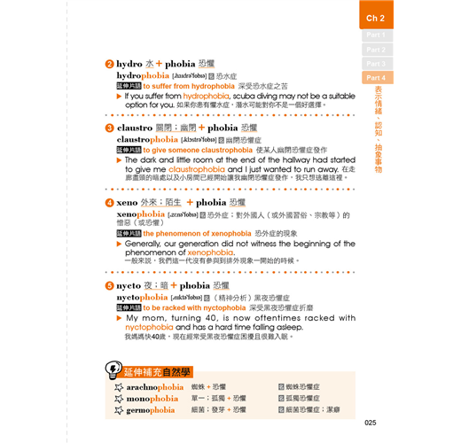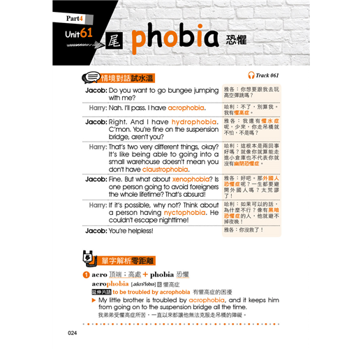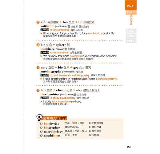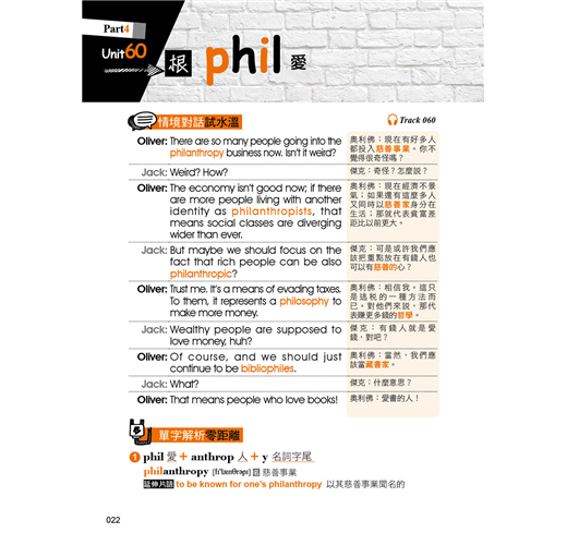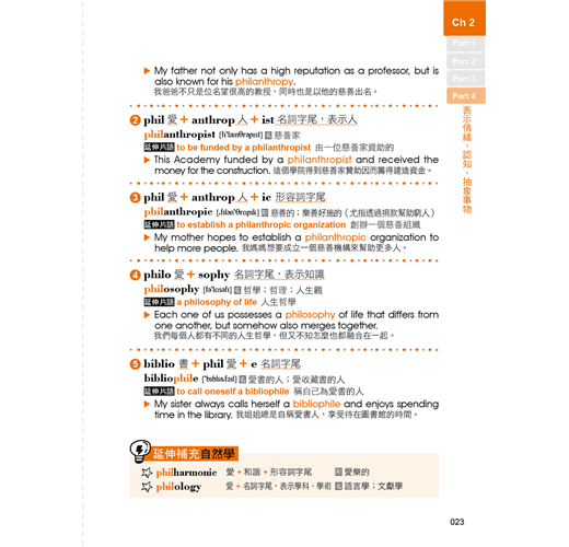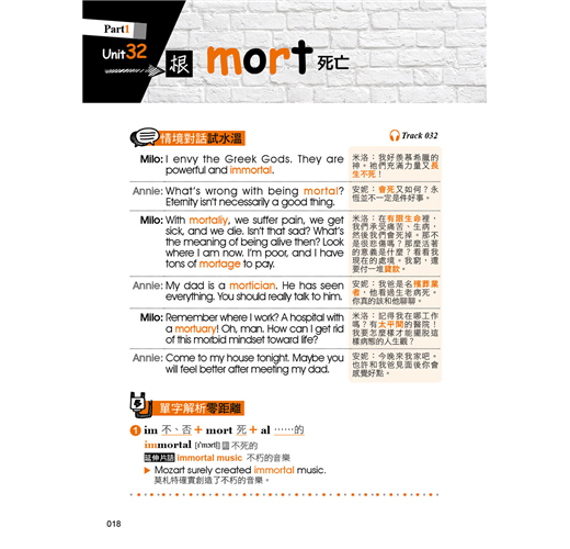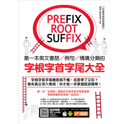 本書除了有符合記憶邏輯的目錄之外,在內容的編排上,也擺脫一般只用例句來記憶字根、字首,以及字尾的方式,反而是依照範例單字編寫情境會話,使讀者對該字根、字首,或是字尾的印象大大加深。除此之外,每個範例單字都還會再配上一個常用片語以及片語例句,學習者在記下單字的拼法就能一併學習該單字在句子中的正確使用方法。如此一來,讀者不僅可以透過情境對話掌握單字的使用脈絡,也可以單純利用例句來做學習,短時間內惡補也沒問題!
