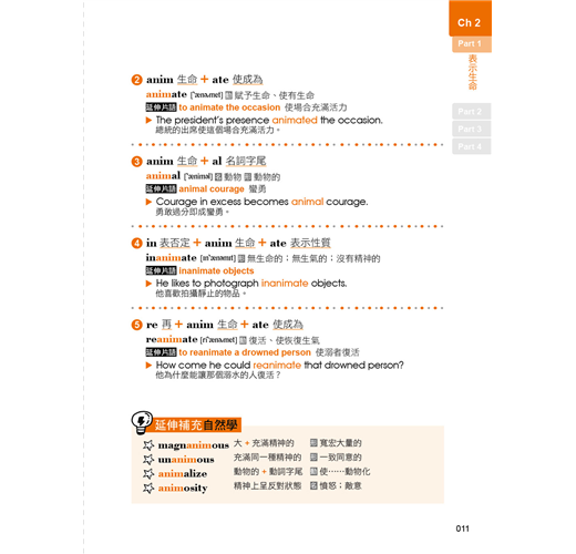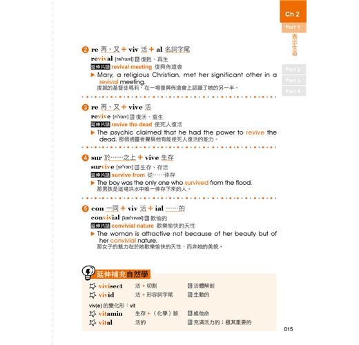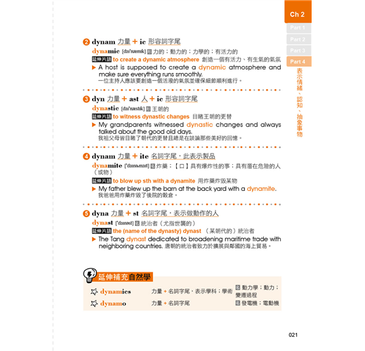 除了主要學習的字首、字根、字尾之外,其更變化型或同義字也很重要!本書大量補充與每個字首、字根、字尾同語源的單字,並透過簡單的基本拆解,讓學習者能快速理解各補充單字的意義由來,使讀者可以把同語源單字也學起來,快速擴充單字量。除此變化型之外,本書更是貼心收錄具有相近義的字根、字首,以及字尾,同場較勁,使讀者不僅可以一同吸收較少見的近義字,還可以詳加比較兩者之間的差別,字根、字首,以及字尾的學習變得更靈活萬用!
