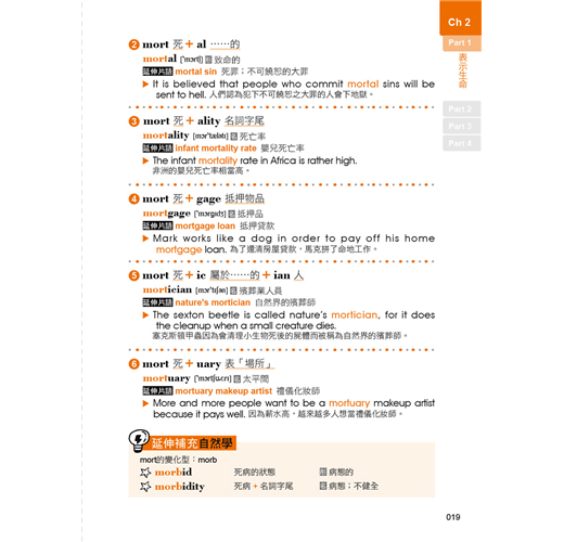 本書擺脫傳統學習字根、字首,以及字尾的編排方法,在最大的章節不依照字根為一、字首為二,以及字尾為後的分類方式,而是先用情境分成五大章節,接著細分下來,也不依字母 A~Z 來排序,而是將具有相近意思的字根、字首,以及字尾放置在一起,依照一定的邏輯,條列在每一個 Part 之中。同時,讀者也不用擔心無法掌握該字屬於字根、字首,還是字尾,因為本書特別精心設計首、根、尾三個標示,讓讀者可以一次掌握具有相近意思的字根、字首,以及字尾,用最有效率的方式掌握重點!