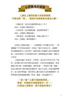 手冊以書中24個「心靈力量啟動練習」為主,輔以實用表格,以筆記頁形式呈現,幫助你記錄實踐的歷程與取得的成果。精選中英對照金句激勵你克服惰性,最後的「自我分析問卷」幫助你更誠實地面對自我,帶給你智慧察覺周遭的「干擾」,勇敢向這些干擾說:「不!」